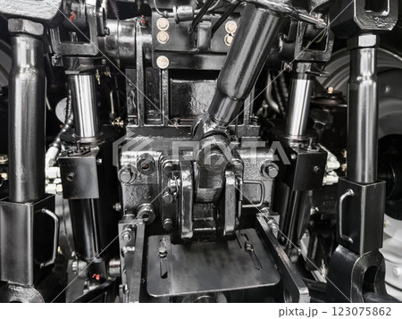 Intricate view of hydraulic system components in heavy machinery during maintenance inspection at a workshop