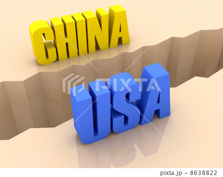 Two countries CHINA and USA split on sides, separation crack. Concept 3D illustration.