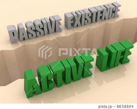 Two phrases PASSIVE EXISTENCE and ACTIVE LIFE split on sides, separation crack.