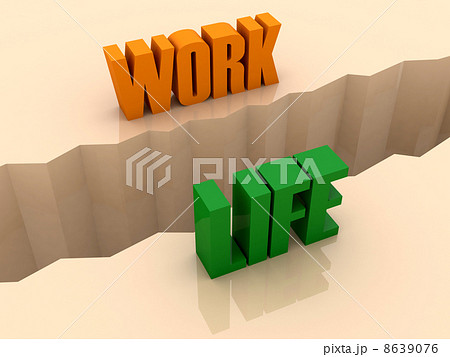Two words WORK and LIFE split on sides, separation crack. Concept 3D illustration.