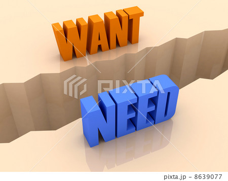 Two words WANT and NEED split on sides, separation crack. Concept 3D illustration.