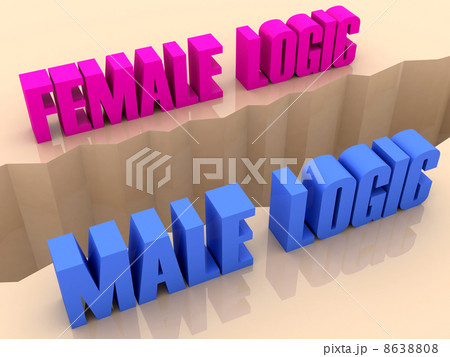 Two phrases FEMALE LOGIC and MALE LOGIC split on sides, separation crack. Concept 3D illustration.