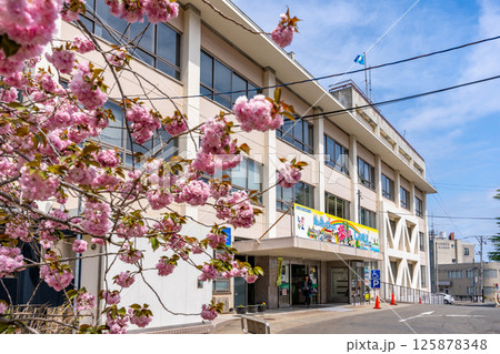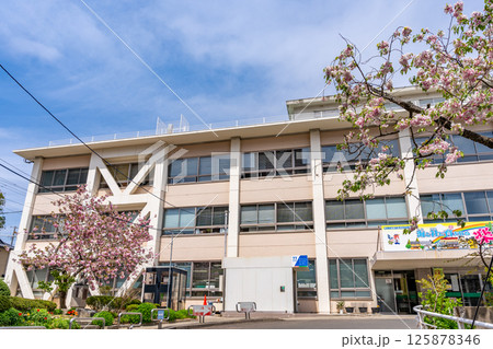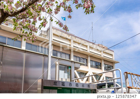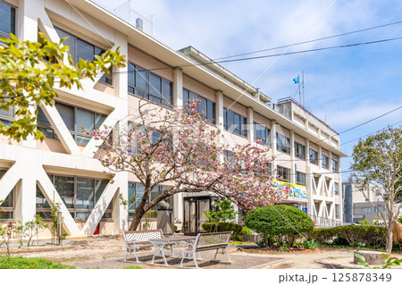 塩竈市役所本庁舎 満開の桜 青空 昭和35年に建設 新庁舎令和9年共用開始想定