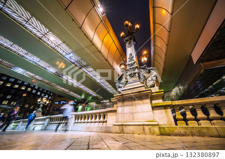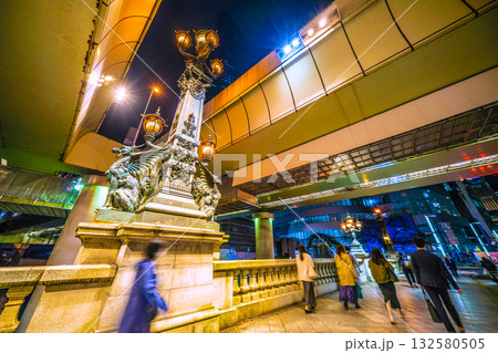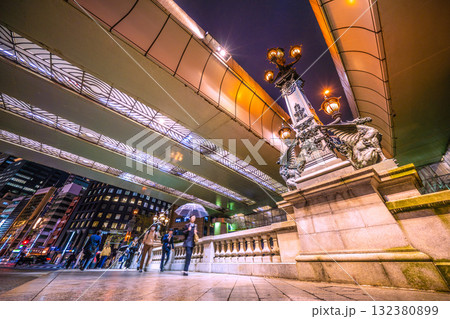 日本の東京都市景観 夜の日本橋。首都高速道路高架下も美しい光が…