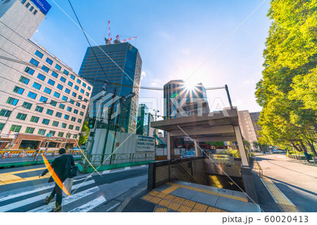 日本の東京都市景観 「虎ノ門」の交差点や虎ノ門駅前の再開発、地下の歩道建設などを望む