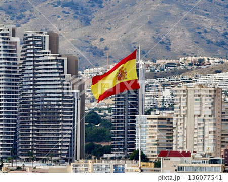 Spanish flag waving, Vibrant seaside cityscape with highrise buildings and sunny Mediterranean backdrop