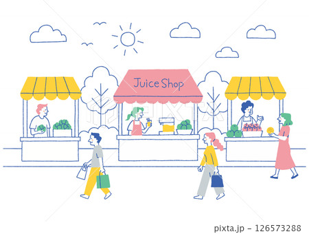 太陽の下でにぎわうマルシェの風景_色