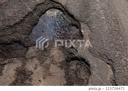 A cracked asphalt section shows a dangerous water-collecting hole, emphasizing the urgent need for traffic safety maintenance