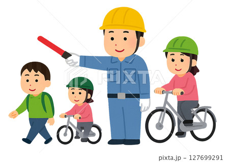 作業員が歩行者と自転車を誘導しているシーンのイラスト(フラットデザイン)
