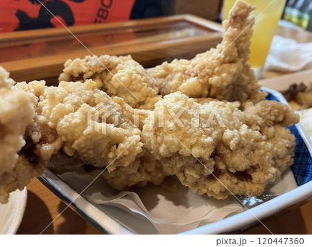 沖縄の焼物(やちむん)の皿に載せられた鶏唐揚げを接写。フレンチポテトとシークワーサー添え。