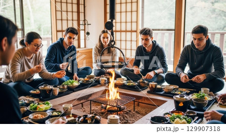 外国人観光客が囲炉裏を囲んで食事体験