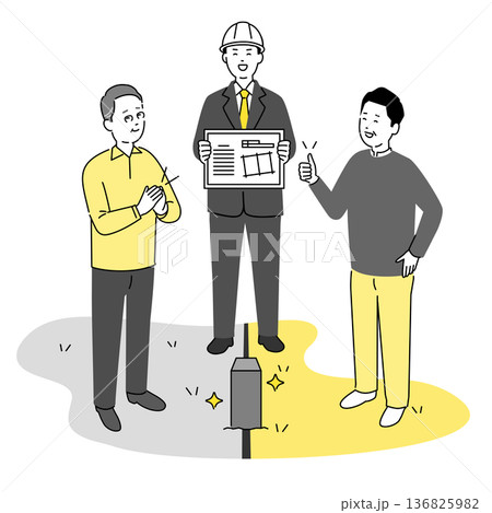 測量_土地境界の合意イラスト 土地家屋調査士による境界確認と近隣住民の合意成立