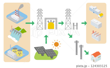 様々な発電所。水力、太陽光、バイオマス、地熱、風力、火力、原子力。