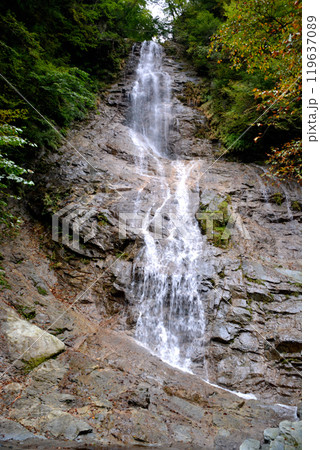 50mと言われる滑らかな岩壁を一筋の雨のように細く長く流れ落ちる雨棚