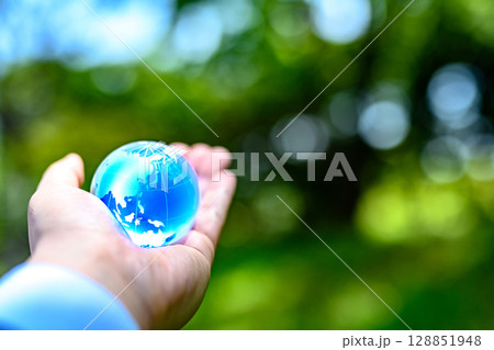 綺麗な新緑にかざす地球儀の水晶 エコロジーイメージ 青色ノーマル