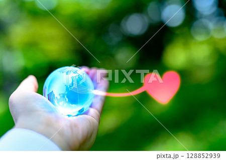 綺麗な新緑にかざす地球儀の水晶 日本から集まるハート 地方の力 エコロジーイメージ 水色