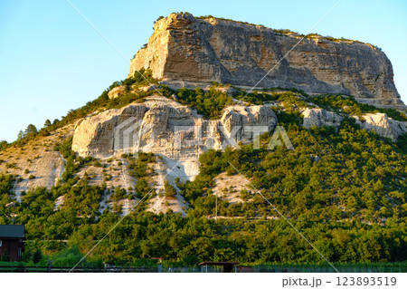 Majestic limestone cliff rises above lush greenery at sunset in natural park