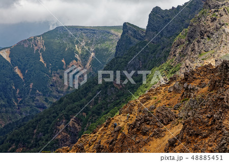 八ヶ岳連峰・赤岳稜線から見る中岳と地蔵尾根を登る登山者