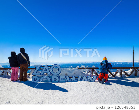 ロープウェイ山頂駅の展望台から樹氷原を眺める人々 (山形県、蔵王温泉スキー場、地蔵山頂)