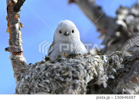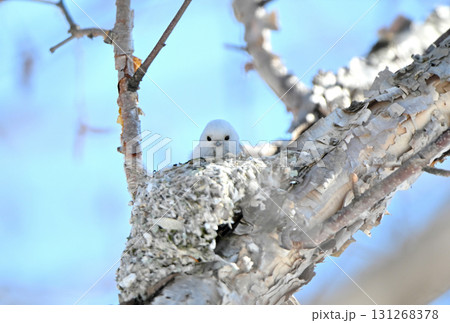 冬の北海道の公園で巣作り中のシマエナガ