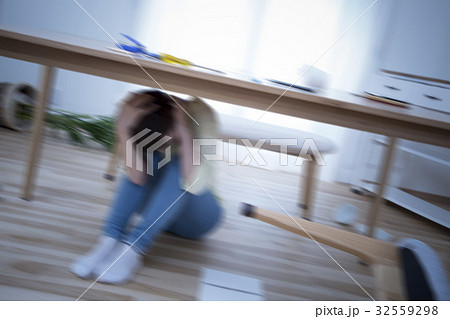 地震のときテーブルの下にもぐる女性
