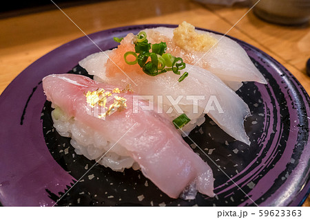 回転寿司 三種盛り 白身盛合せ 氷見 赤ガレイ カワハギ マハタ 接写