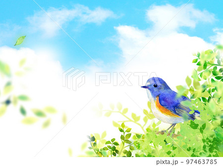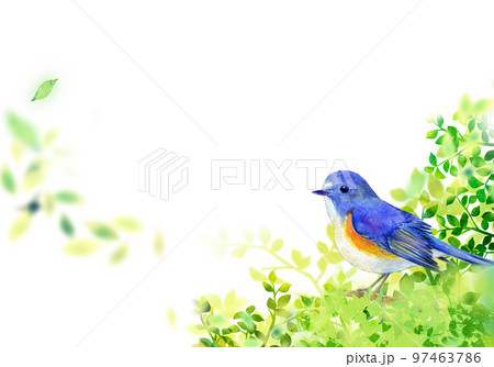若葉にとまるルリビタキ 水彩イラスト