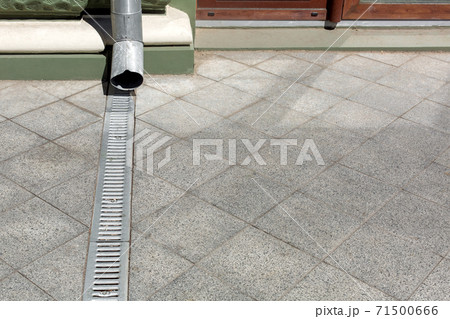 engineering structure downspout on facade building with drainage grate of gray stone granite sidewalk from square tiles on floor with copy space, closeup details city infrastructure, nobody.