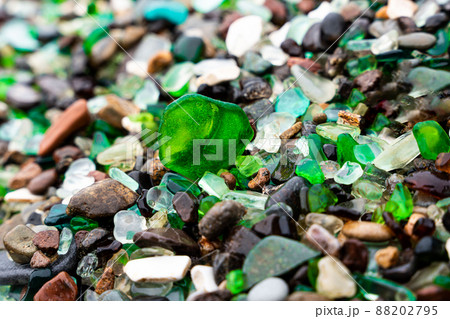 Glass Bay in Vladivostok. Sea-polished colored glass on the beach. Background, texture