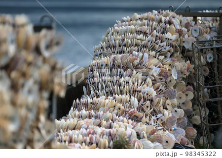 種付け用ホタテの貝殻と虫明漁港の風景1 岡山県瀬戸内市