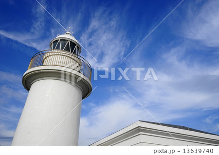 快晴の青空をバックに白い灯台の丘の上に建つ白亜の城ヶ島灯台
