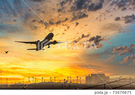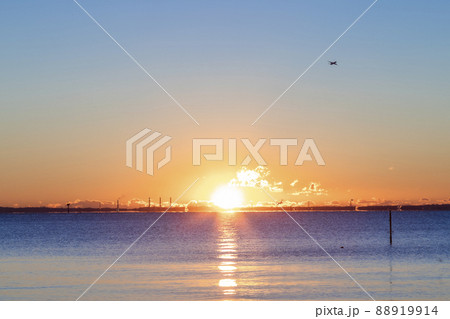 冬晴れの城南島海浜公園から望む羽田空港へ着陸に向かう旅客機 逆光に輝く