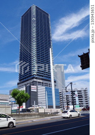 広島駅南側の駅前大橋周辺の市街地風景です。特徴的な柱状の塔や百貨店ビル等が見えます。広島県