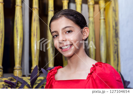 Sweet teenager girl in Cartagena de Indias. Travel concept. Sitting alone. Happy girl.