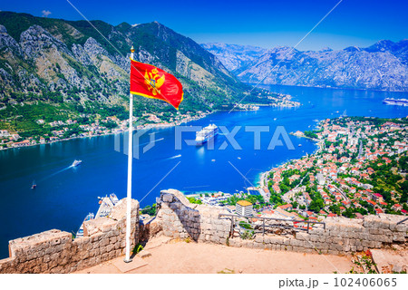 Kotor, Montenegro. Scenit sparkling Bay of Kotor, medieval walled city.