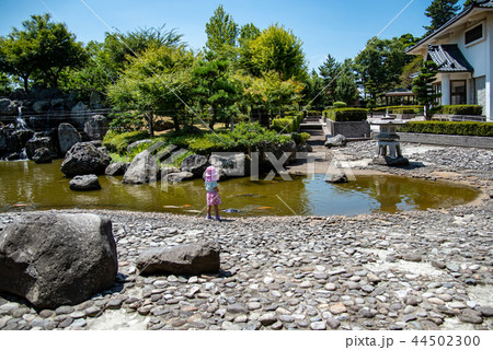 福井県 丸岡城 現存する日本最古の天守閣 歴史民俗資料館前の池で遊ぶ子ども