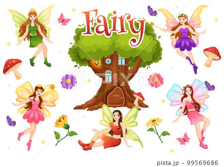 Beautiful Flying Fairy Illustration with Elf, Landscape Tree and Green Grass in Flat Cartoon Hand Drawn for Web Banner or Landing Page Templates