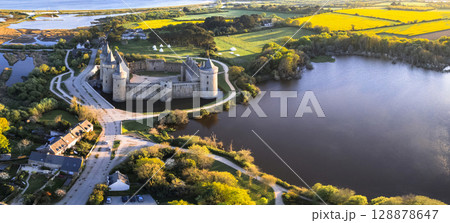 Most beautiful medieval french castles - amazing chateau de Suscinio (Susinio) over sunset in Brittany.