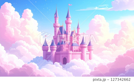 Pink princess castle floats in clouds. Fairytale palace illustration.