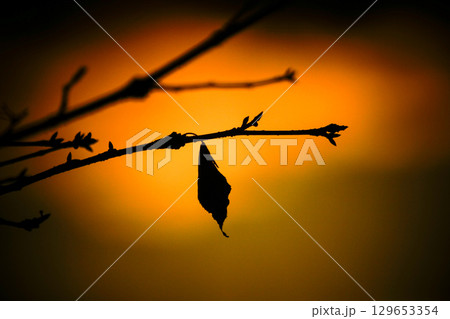 北海道の晩秋の頃に夕暮れの光の中にわずかに残った一枚の葉っぱ