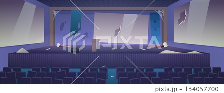 An empty lecture hall with broken screens, chairs, a dirty stage, debris, and cobwebs.