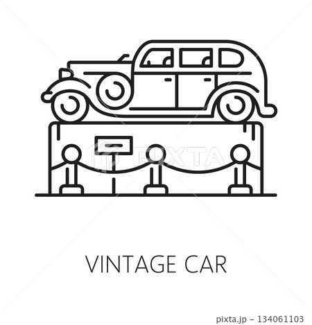Vintage car museum exhibition line icon or pictogram. Transport history museum exhibition outline icon, vintage automobiles collection gallery line symbol with retro auto or vehicle on podium