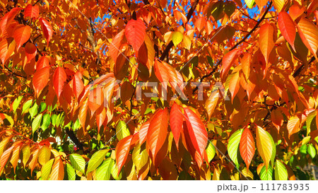 紅葉したヤマザクラの葉と樹木と青空の美しい風景