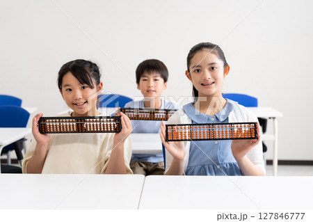 そろばん教室で学ぶ小学生の集合