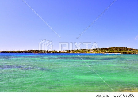 沖縄 本部 備瀬埼から望む伊江島とマルエーフェリー