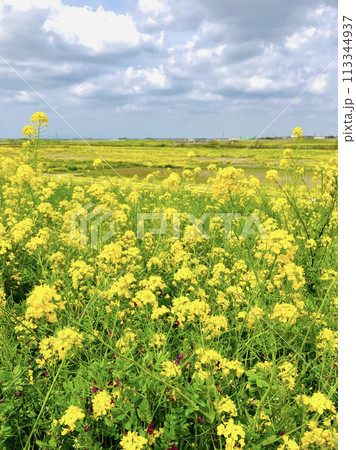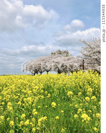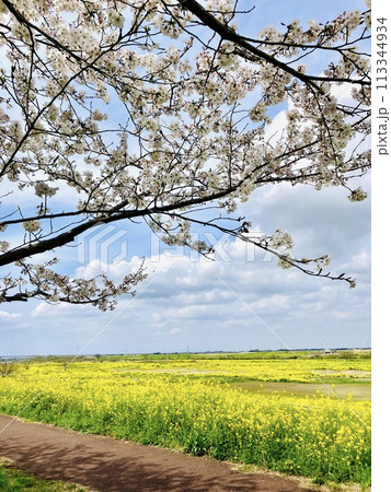 菜の花畑の向こうに広がる青空と桜の木_千葉県野田市_関宿城跡