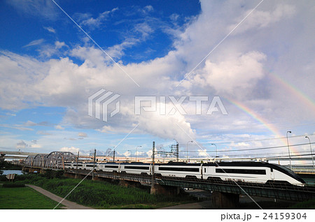 堀切橋を渡る京成スカイライナーと二重の虹