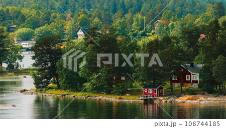 Swedish Wooden Sauna Logs Cabins Houses On Island Coast In Summer Cloudy Day. Bold Colors. Many Red Swedish Houses. Travel to Sweden