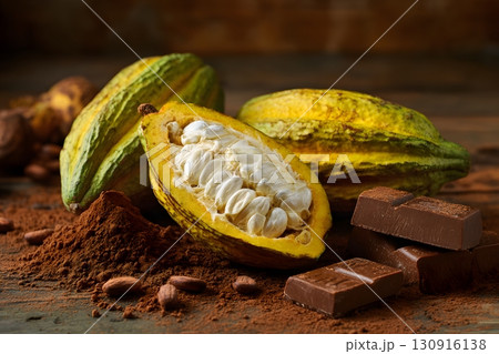 Cacao pods and chocolate pieces sit on a wooden surface.
