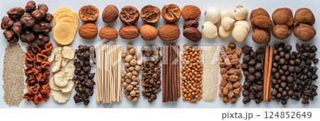 Rows of nuts, seeds, and spices displayed neatly on a table; emphasizing their diversity as ingredients for cooking or wellness products creation.